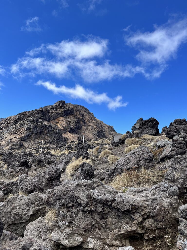 Frohgelaunt starten wir. Wir tauchen ein  in die bizarre Vulkan-Landschaft und legen an der 1. Hütte, an der wir ursprünglich übernachtet hätten, eine kleine Pause ein. Eine wunderschöne Hütte mit einer netten Rangerin in Linneas Alter. Die „Hütte“ ruft: bleibt hier, hier ist es schön!
