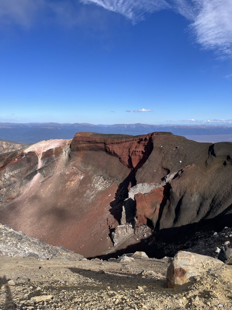 Auf dem weiteren Weg zum höchsten Punkt, der bei ca 1900 Metern liegt, wird der Wind immer heftiger und unangenehmer. Wir können uns kaum noch verstehen, so laut sind die Windgeräusche. Dann sind wir oben, sehen den „Red Crater“ und blicken auf die „Emerald Lakes“. Sie leuchten wunderbar in dieser kargen Gegend. Wir sind hin und weg aber wirklich Zeit fürs Genießen haben wir nicht. Der Wind ist sooo heftig wie am Nordkap und dunkle Wolken ziehen schnell herauf. Es folgt ein Abstieg auf losem Schotter, der Christian fordert, und bis zur Hütte ist es auch noch unendlich lang. Ojeeh, die Stimmung ist am Kippen. Aber es nützt nichts. Wir müssen durch.