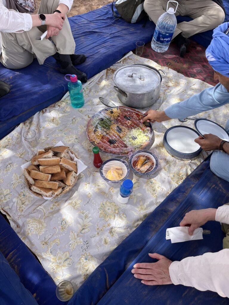 Bei einer kleinen Vormittagsrast etwas später gibt‘s wieder lecker Datteln, Feigen und verschiedene Nüsse. Die Sonne knallt heute ziemlich und ab und an ist ein vorbeiziehendes Lüftchen sehr willkommen und angenehm. Die Etappe ist recht lang, ein Mitreisender hat Kreislaufprobleme. Alle sind besorgt und kümmern sich mit vollem Einsatz. Schließlich organisiert Youssef ein „Taxi“,  das den Geschwächten abholt und ins Hotel bringt. Wir laufen noch eine knappe Stunde bis zu unserer Mittagsrast wo unser Koch schon wieder das Mahl bereitet hat. Wie kann er nach vier Tagen in der Wüste immer noch Gurken, Tomaten, Paprika, frisches Obst und Fleisch kredenzen??? Youssef erklärt, dass die Zwillings-Körbe, die von den Dromedaren getragen werden, Löcher haben, durch die die Luft zirkuliert. Oben müssen die Körbe mit einer dicken Decke abgedeckt werden. Das reicht wohl aus für die Erhaltung der Lebensmittel! Die Körbe werden heute aus Plastik geflochten, was weniger geeignet ist als Palmblätter. Damit wurden die Körbe früher geflochten. Nachteil dieser natürlichen Körbe ist, dass sie schnell kaputt gehen.