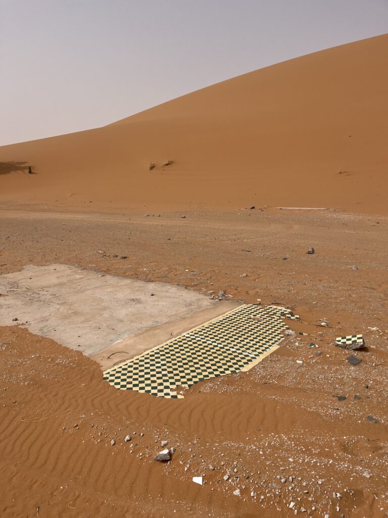 Auf ins nächste Abenteuer. Wir laufen zunächst noch recht flach, fest und steinig weiter. Langsam nähern wir uns mehr und mehr den feinen und höheren Sanddünen. Noch vor der Mittagspause überqueren wir schon einige massive Sanddünen. Mittags rasten wir unter Eukalyptusbäumen, die in einem ehemaligen Luxuscamp liegen. Davon haben wir schon mehrere gesehen. Sie sind zum Teil aufgegeben und nicht schön anzuschauen. Leider werden sie nicht komplett abgebaut. Wir sehen Müll, Betonplatten, Fliesen, Porzellan von Stehklos, etc. Auch an anderen Stellen sehen wir häufig altes Plastik, das sich in kleinen Büschen festkrallt. Und einige Male beobachten wir auch Jeeps oder Quads, die durch die Wüste heizen. Manchmal sehen wir auch nur deren Spuren. Das ist leider die andere Seite der besonderen Atmosphäre hier.