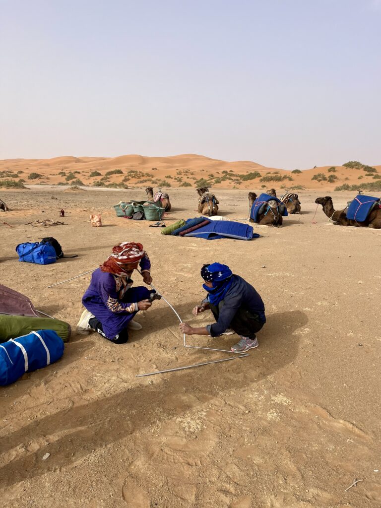 Am Lagerplatz steht das Küchenzelt und gerade wird das Toilettenzelt aufgebaut. Unsere Schlafzelte -für jeden ein eigenes- bauen wir zusammen auf und dann werden wir schon wieder zum Tee gerufen. Das Team kümmert sich schon wieder ums Essen. Wir haben noch viel Zeit zum Rumsitzen und Chillen. Unser Koch hat leckeres Essen zubereitet: Suppe, Leckeres aus der Tajine, Erdbeer-Dessert!