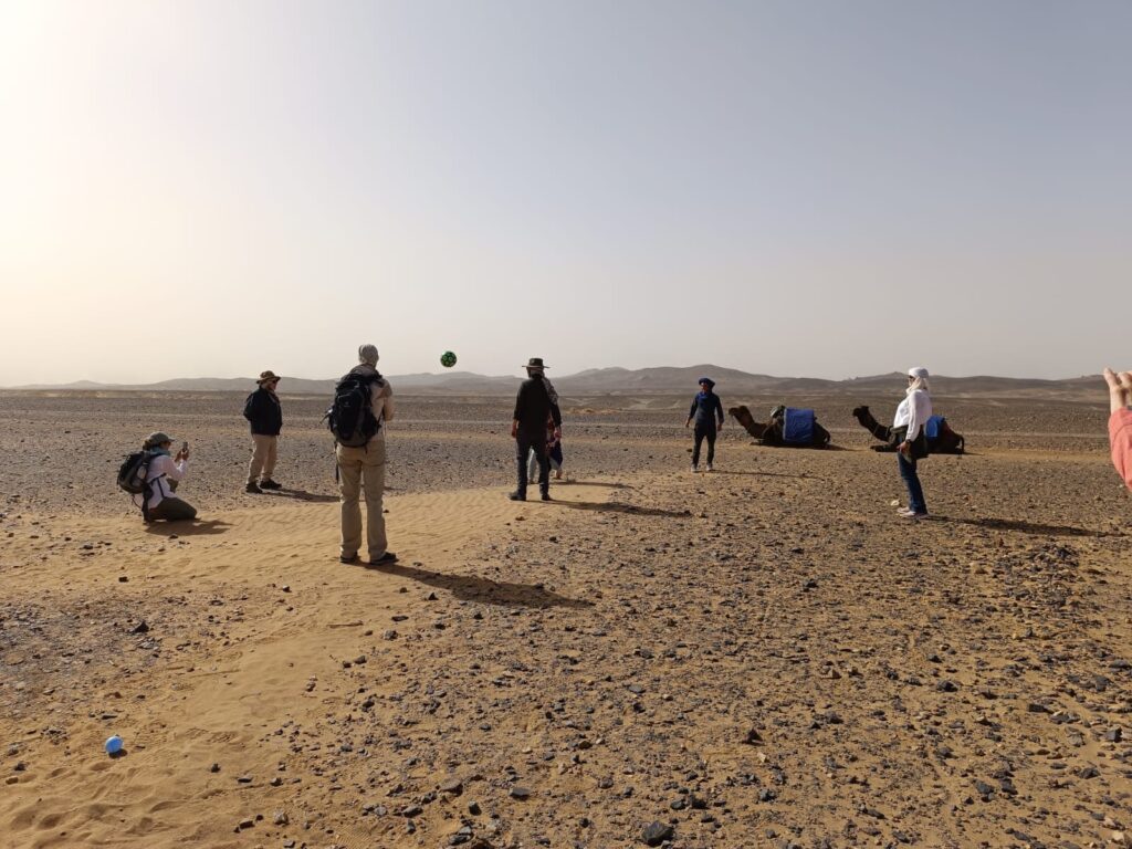Schon kurz nach dem Start sind in etwas Entfernung Nomadenzelte zu erkennen. Youssef bietet uns an, dort vorbeizugehen, um die Lebensweise der Nomaden kennen zu lernen. Wir steuern darauf zu und können erst in unmittelbarer Nähe erkennen wie provisorisch (mit unseren Augen gesehen) die Familie lebt. Es gibt ein paar Zelte, deren Wände aus Teppichen, Folien, Decken, etc. zusammengeschustert sind. Wir besuchen eine Frau mit drei kleinen Kindern. Der Mann ist gerade nicht hier. Die Frau ist sehr zurückhaltend. Youssef vereinbart mit ihr, dass sie Tee für uns macht. In der Zwischenzeit versuchen einige Mitreisende Kontakt zu den Kinder aufzunehmen. Ein Ball wird ins Spiel gebracht und schon geht es los. Dann gibt es den Tee, manche der Mitreisenden trauen sich nicht an den Tee – die Verhältnisse sind einfach. Ob unsere Mägen das vertragen? Ich und weitere Mitreisende vertrauen auf Youssef, der einen Blick für die Zustände hat und wir trinken für die Anderen mit.