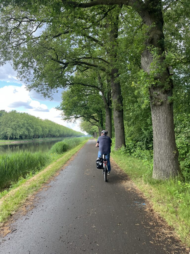 Bei einem Besuch bei Christians Schwester Claudia im Emsland kommt die Idee auf, ein E-bike mit weichen Reifen und Federgabel auszuprobieren. Zufällig hat Claudia eins. Wir besuchen damit Christians Tante Hilde. Christian fährt die 50 km an dem Tag locker und bleibt fast schmerzfrei.